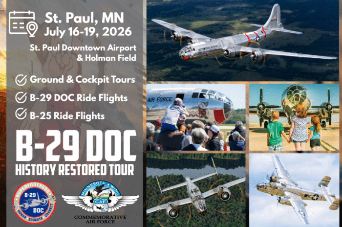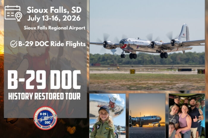The B-29 DOC History Restored Flight Experience Tour will land at Sioux Falls Regional Airport, July 13-16, 2026. Purchase B-29... Read More