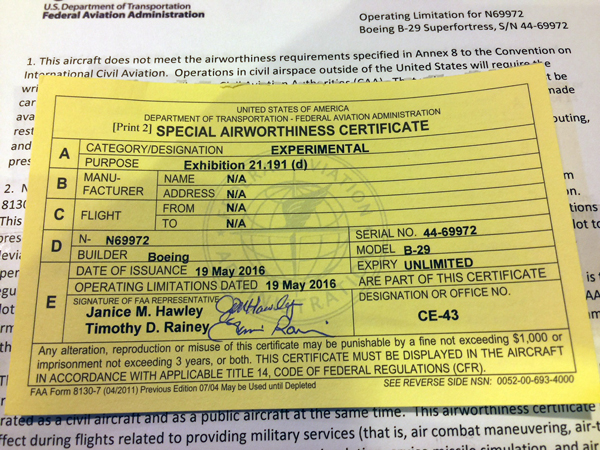 The airworthiness certificate is the most notable milestone yet for the team working to restore the historic B-29. It also comes three days before the 16th anniversary of Doc arriving in Wichita on May 23, 2000 to begin its restoration journey.